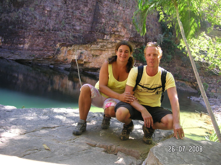 De weg er naar toe is weer super gaaf! De 4wd moest weer aan en het was ploeteren door los zand wisselend met rotsachtige weg, losse stenen en veel kreekjes waar we doorheen moesten, sommigen waren zelfs spannend want de kuilen in het water waren soms erg diep waardoor we flinke tuimelingen maakten, hahaha...grappig hoor! Het blijft leuk om 4wd te rijden! Om bij de Twin Falls te komen moesten we zelfs een heuse rivier door! De ranger had wel gezegd dat het water op sommige plaatsen 60cm hoog was maar wij dachten dat ie gewoon die kreekjes bedoelde, NOT....we moesten dus de rivier door, met 60cm water hoog en de krokodillen liggen in deze rivier! Spannend dus! Het was echt zo super om te doen, de rivier was op de plaats waar we er door heen moesten zeker 20 mt breed, dus wel even wat anders dan een kreekje he! Gaaf om te doen joh! Dan weet je weer even waarom je een 4wd hebt gehuurd hoor! En dan maar hopen dat je auto er niet ineens mee ophoudt he, want wat moet je doen als ie ineens stil staat? Je kan er niet uit ivm de krokodillen, blijven staan kan ook niet he..dus dan is het wachten tot er iemand ook wil oversteken en dus terug gaat om hulp te halen, tenzij zij je kunnen helpen.